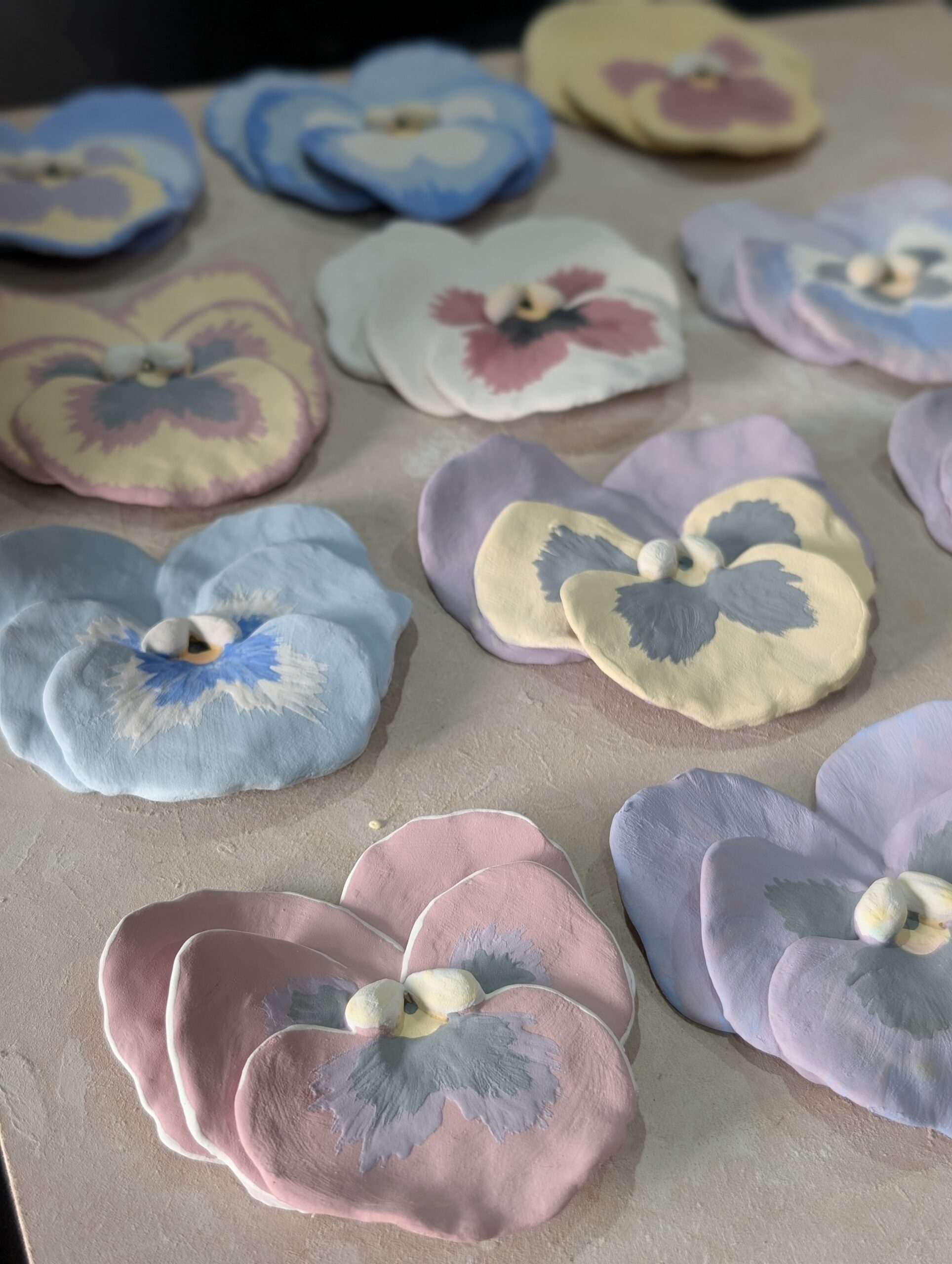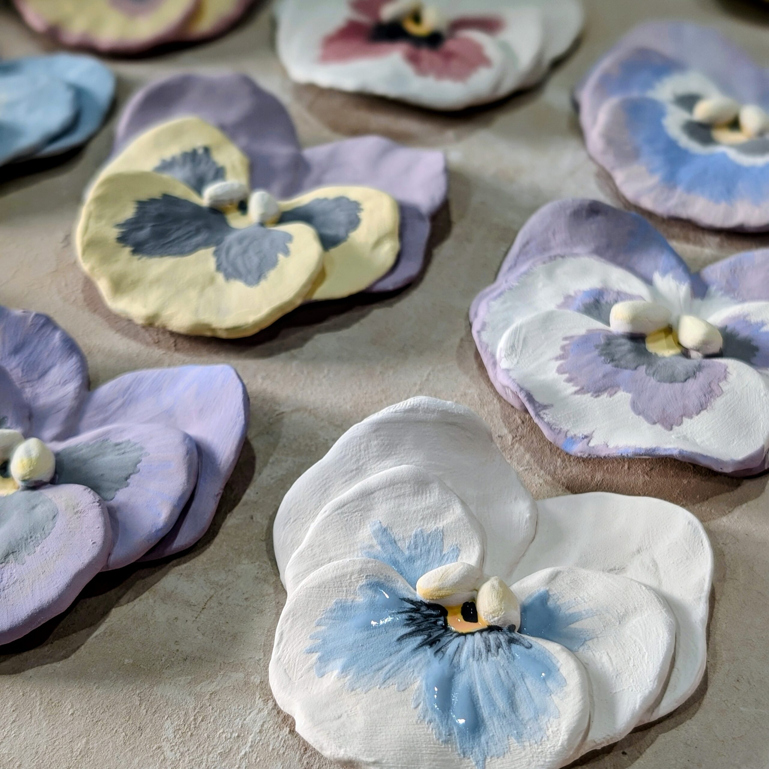 - Roll out clay to 7mm thick and use the cutters to cut out your pansy pieces – you’ll need 2 of the round petal pieces