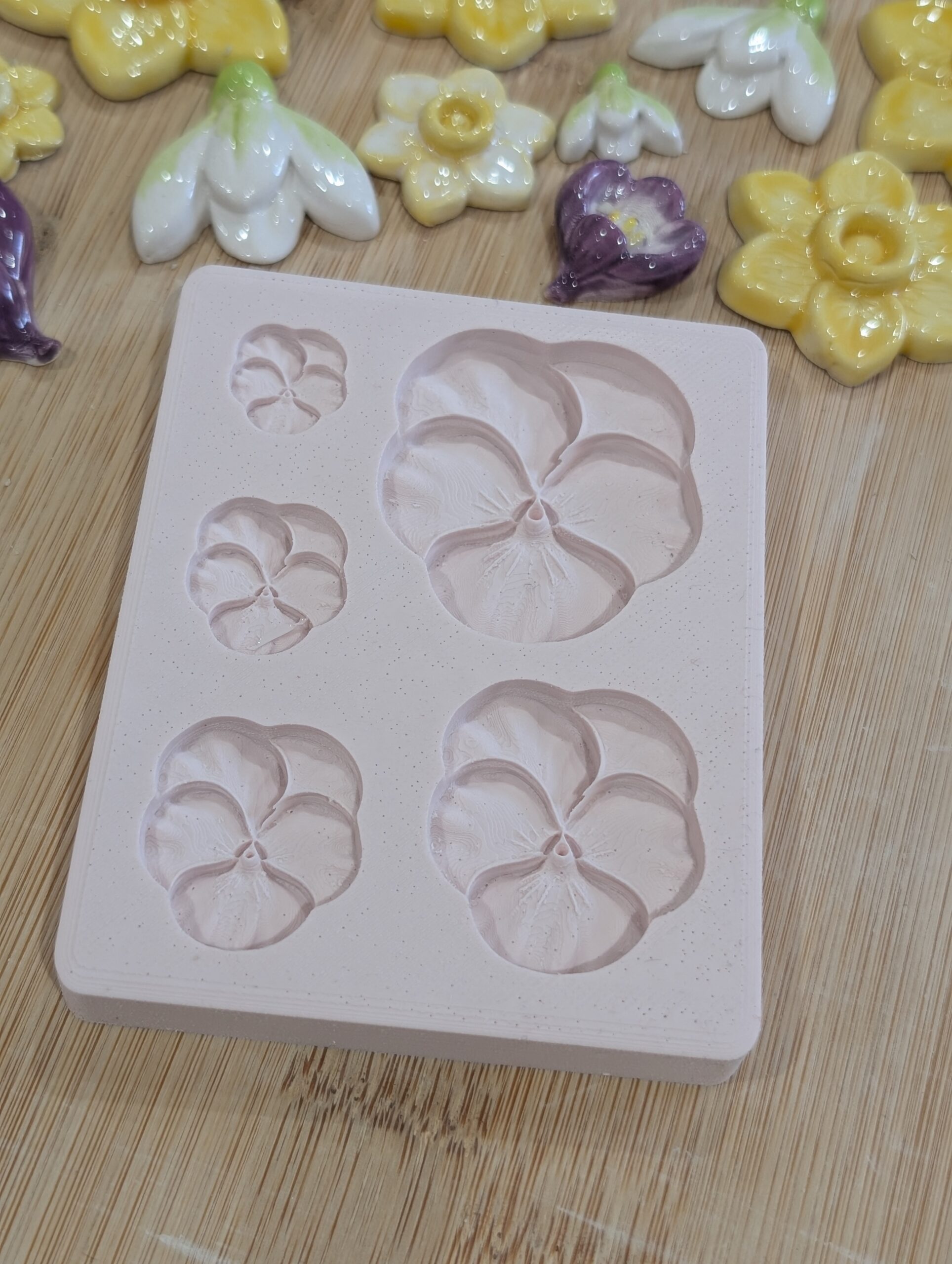 This listing is for a silicone mould of 5 difference sized pansy flowers. The pansy flowers measures 4.5cm, 3.5cm, 2.5cm, 2cm and 1.5cm.